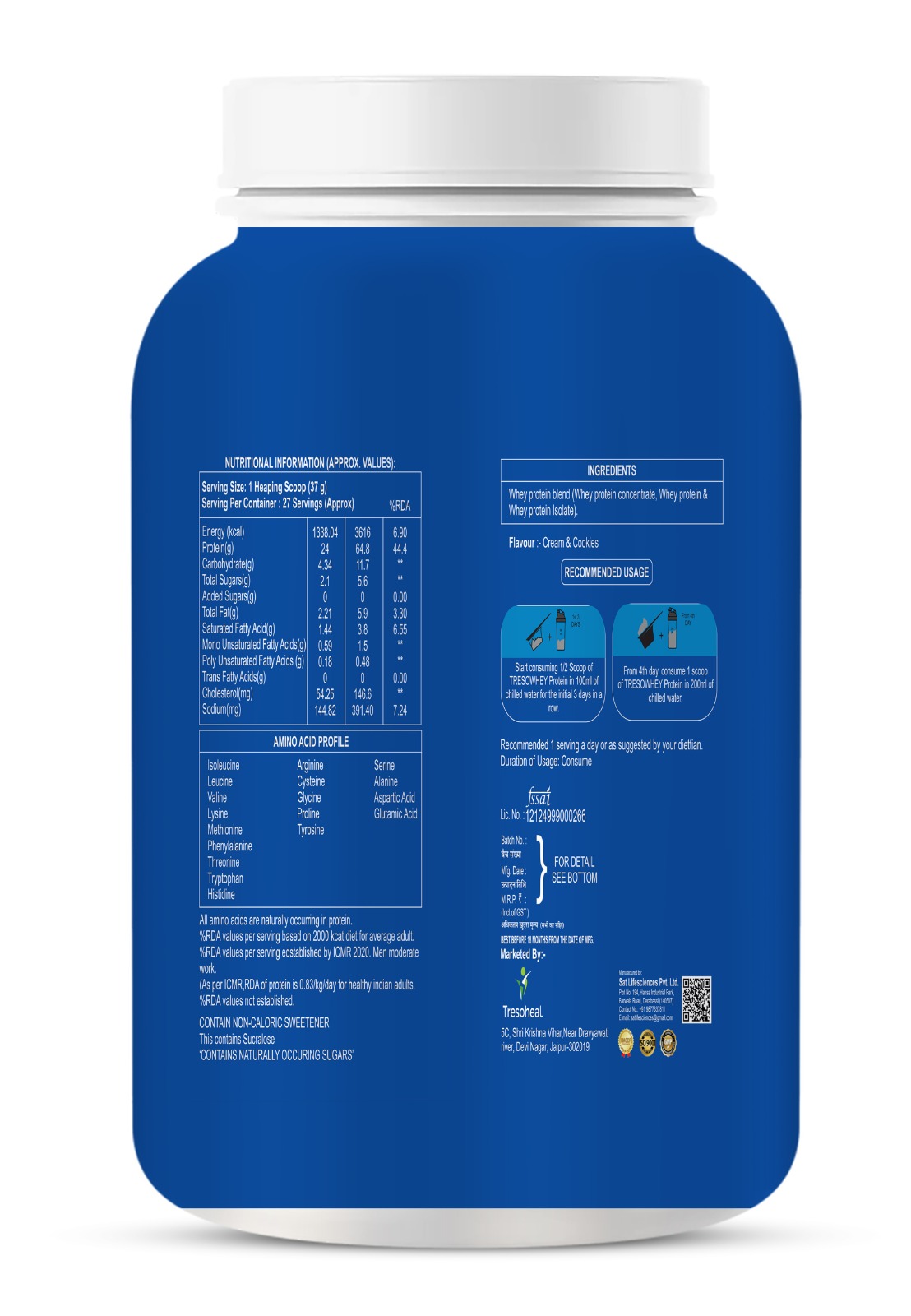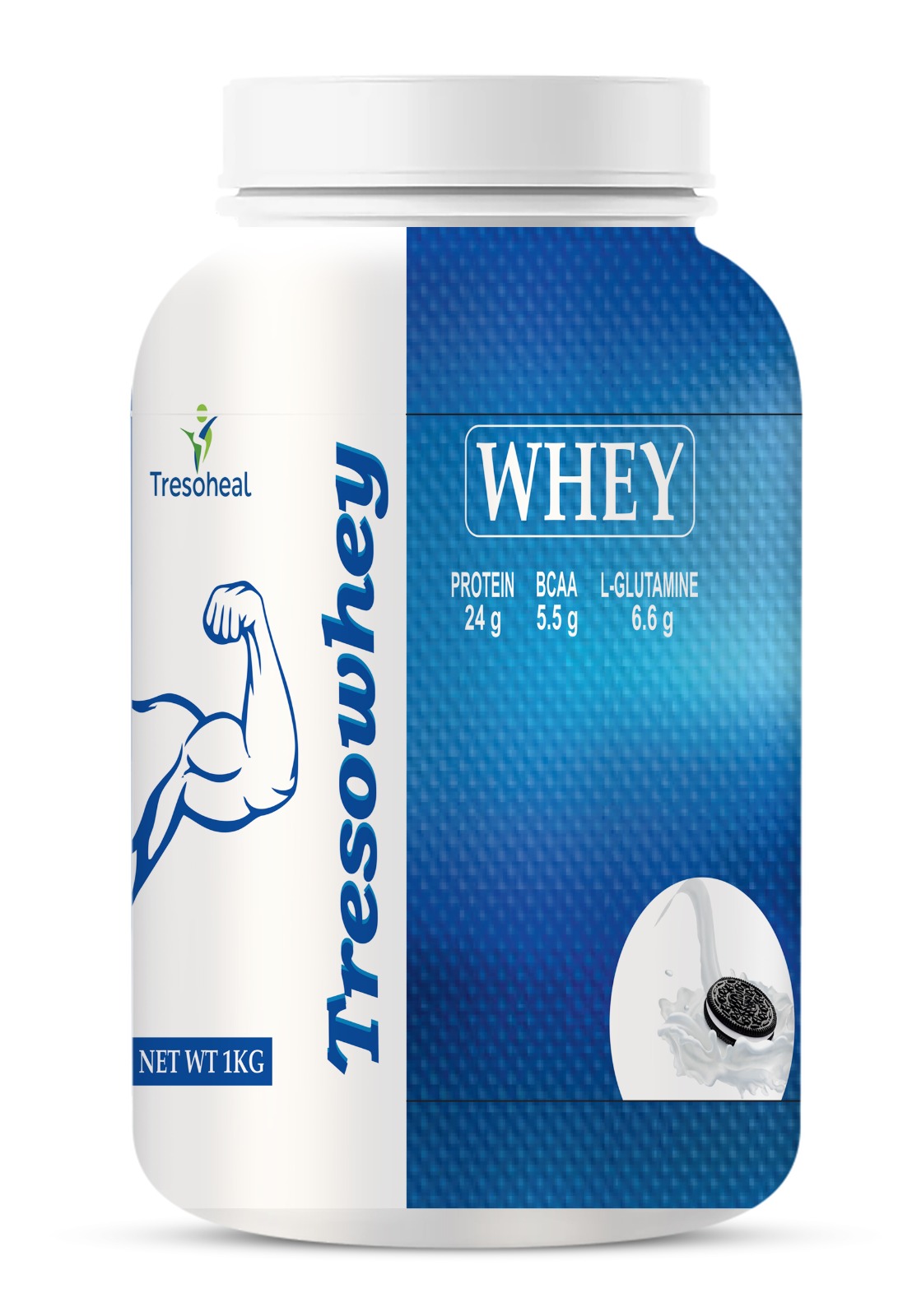 Build strength, fuel recovery, and reach your fitness goals with Tresowhey – a premium whey protein supplement by Tresoheal. Packed with 24g of protein, 5.5g BCAA, and 6.6g of L-Glutamine per serving, Tresowhey supports lean muscle growth, faster recovery, and better performance—deliciously delivered in a smooth Cream & Cookies flavor.